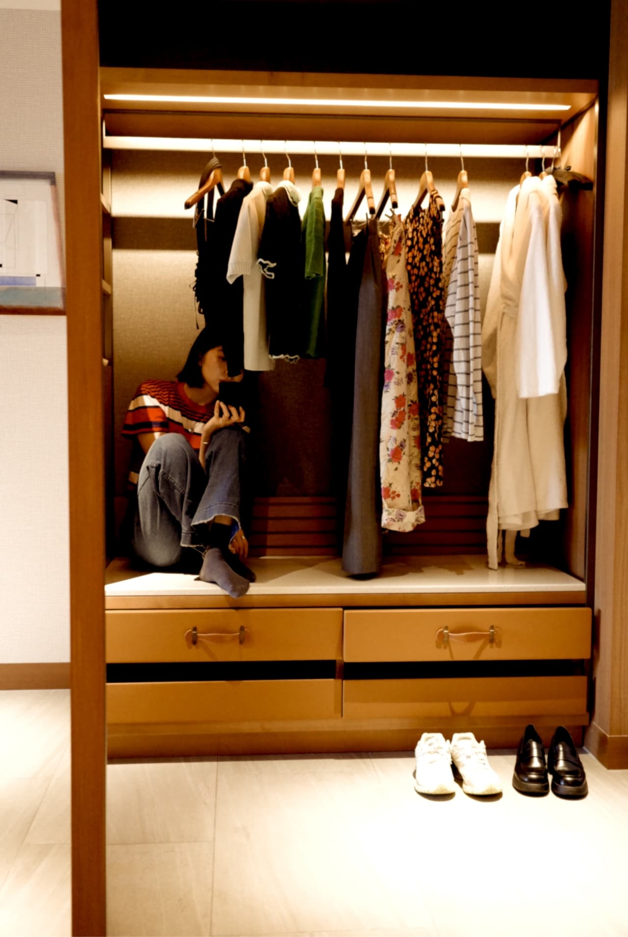 窓際に大きな白い革張りのキャビネットがある。クローゼットは玄関にあるし、これは一体。ディズニー映画「美女と野獣」のクローゼット夫人を彷彿とさせ、喋ったらいいのになんて夢を見る。革の持ち手をそっと引いてみると、広がったのは優しい光の小さな部屋。あっという間に目の前にバーが現れた。引き出しにはドリンクやグラス。そして色とりどりのカラフルな小瓶に入ったお酒たち。お酒をあまり飲まないのについ今夜手を伸ばしてみようかなと思わせるほど胸が高鳴った。そんな気持ちを落ち着かせるべく、ひとまずペットボトルの水を1本手に取り、部屋を出てジムに向かった。