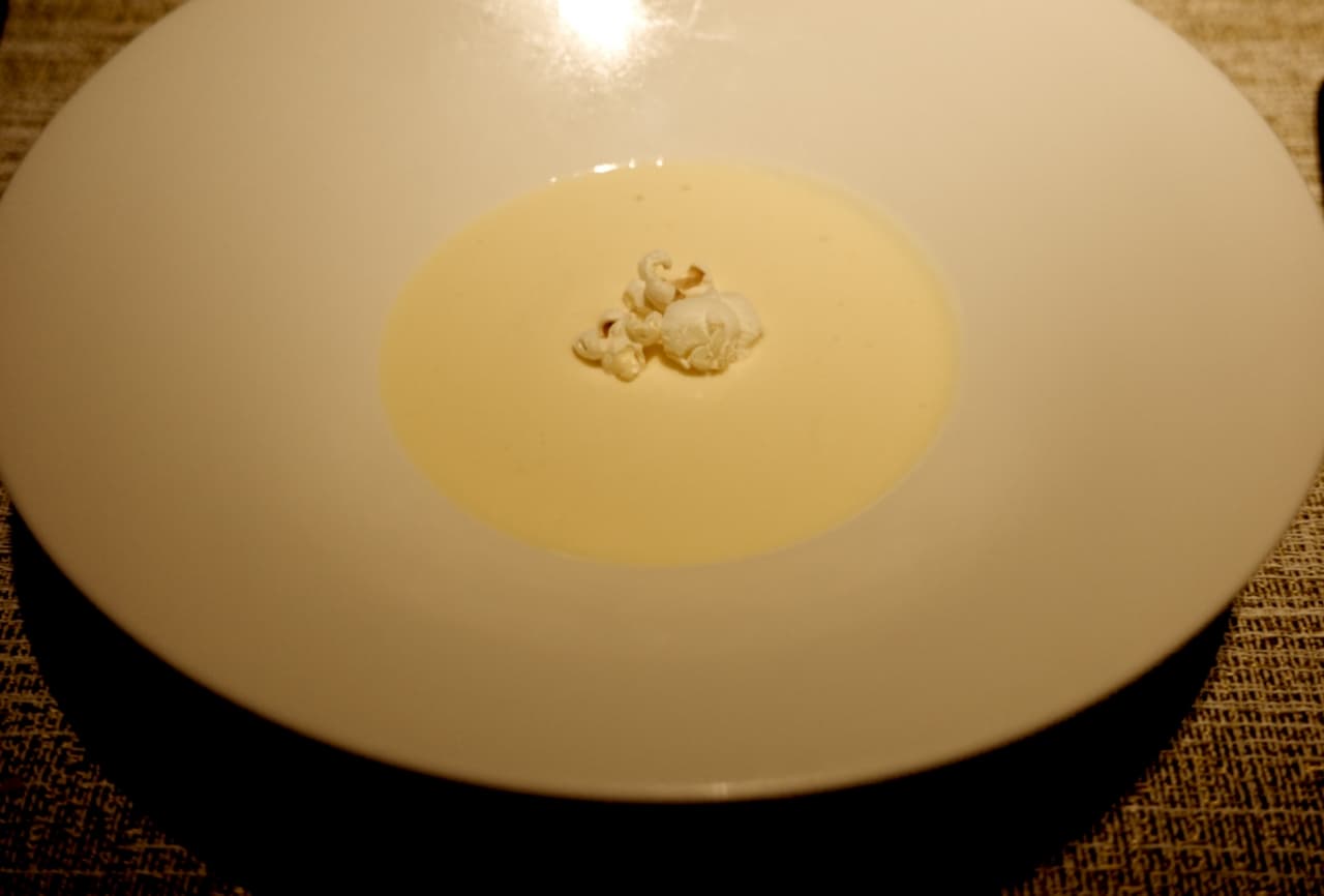 まさか33歳にして一人でキャビアを食す夜がやってくるとは。お母さんに後で報告しよう。一人でいても誰かのことを考えることをやめられず、ホームシックみたいな気持ちが顔を出したとき、本日のスープが運ばれてきた。冷製のコーンスープ、の上になんと見覚えのあるものが浮かんでいる。ポップコーンだ。私はまるで自分の仲間を見つけたかのような安心感に包まれ「あんた、こんなところでどうしたの?」と口元を緩めながらつい語りかけてしまいそうになる。なんて愛らしい姿なんだ。コーンスープに緊張しながら(そう見えた)浮かぶポップコーン。私の緊張はたちまち解け、一気にスープを飲み干した。おかわりなんて言えなかったけど、未だにあのスープにもう一度会いたいと恋焦がれている。