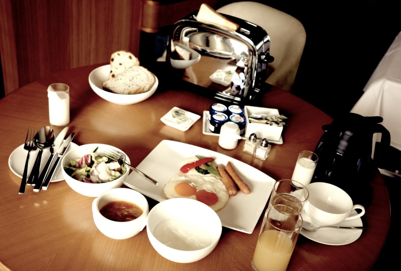 早速アメリカンブレックファストを注文して、身支度や読書をしながら待つ。コンコン、とドアをノックする音と共に待望のルームサービスがやってきた。食パンに目玉焼き、サラダ、スープ、ヨーグルトなど朝食オールスターが私の部屋に集まる。いつも朝食は時間に追われさっと済ませることが多いから、誰かが手塩にかけて用意してくれた朝食は嬉しいに決まっている。その後も、夕方にシーザーサラダとミントティー、お夜食の炊き込みご飯など憧れが束の間の現実になった喜びを存分に味わった。白いクロスの掛けられた配膳台に綺麗に並んでやってくる食事はより一層特別な存在感を放っていた。