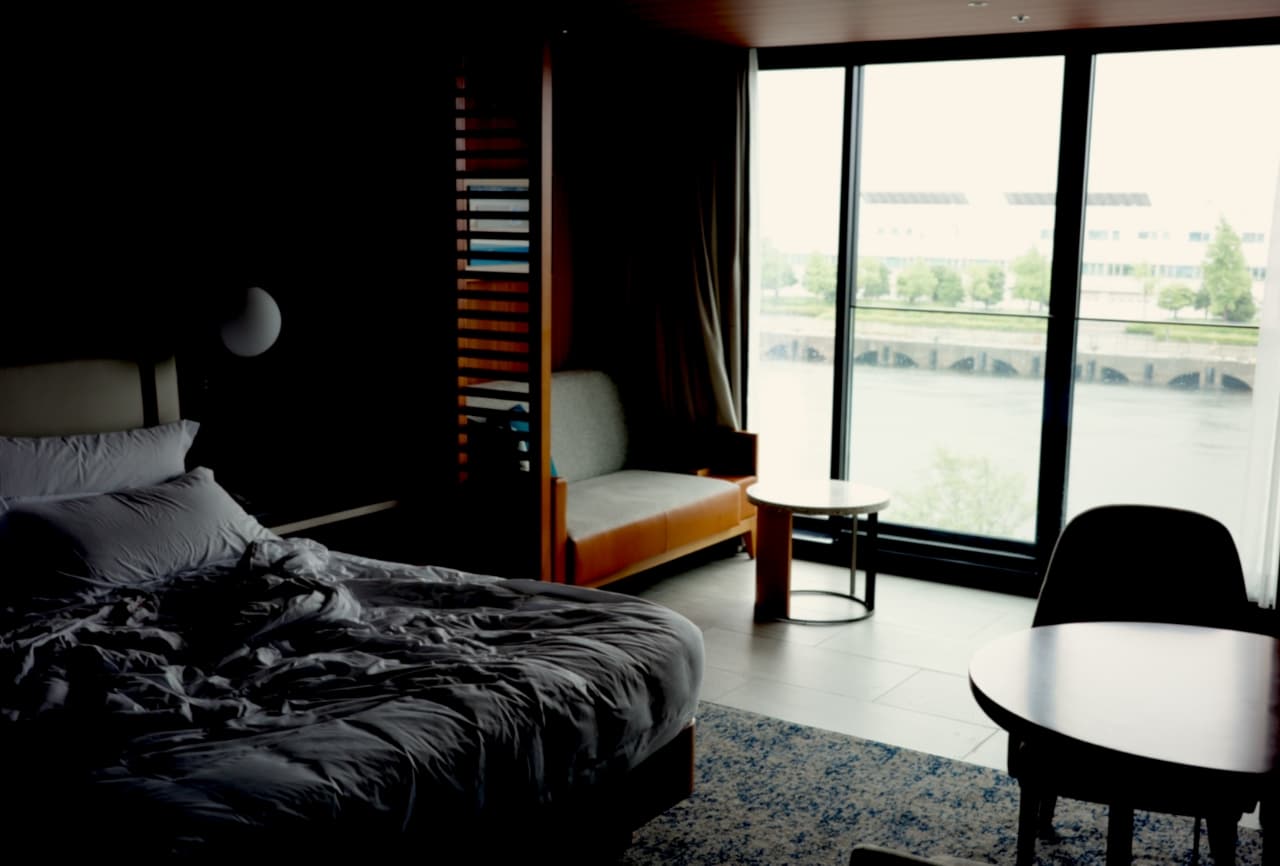 チェックインを済ませ部屋に入ると、暖かな木目調のアールがかった内装が現れた。好みの内装で思わず壁に手を滑らせる。クルーズ客船に乗ったらこんな感じかなと想像を巡らせつつ、大きな窓を開けてみた。密閉された部屋のひんやりとした空気の中に磯の香りの風が混じる。目の前には海が広がり、思わず「わぁ」と声が漏れた。あいにくの曇り空だと思っていたけど、この窓からの景色は日差しなんてなくても充分に気持ちに光を差した。突然、船の汽笛がゴーッと遠くから聞こえる。そして微かに風向きでどこからか音楽も聞こえてきた。合間には波の音が反復している。