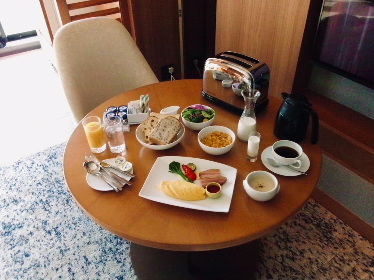 しばらくすると、アメリカンブレックファストがやってくる。ああうるわしき、アメリカンブレックファスト。ポップアップトースターはぴかぴかに磨かれていて、日用品以上の佇まいである。パンが焼けるあいだ、すこし離れたところから朝食を眺めてみる。これらすべてが、わたしのための朝ごはんなのだ、と思うと、あらためて、うっとりする。椅子にすわり、たいへんにっこり食べてゆく。1時間かけて、ゆっくりと味わう。よろこびほうだいの朝だ。